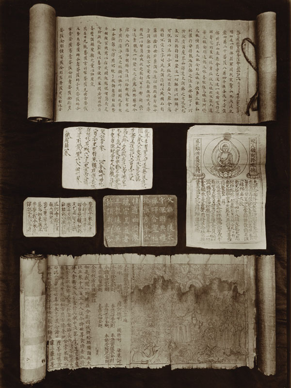 敦煌千佛洞發現的中文手稿及印本 Cat. Stein LHAS Photo 13/1 (75) 藏經洞內大部份的手稿均以中文書寫,還有不少藏文寫本及其他如印度文、伊朗文和土耳其文之類的絲路文字。照片底部可見最古老的《金剛經》版本,為公元868年5月的印本。